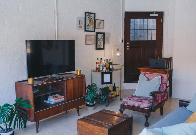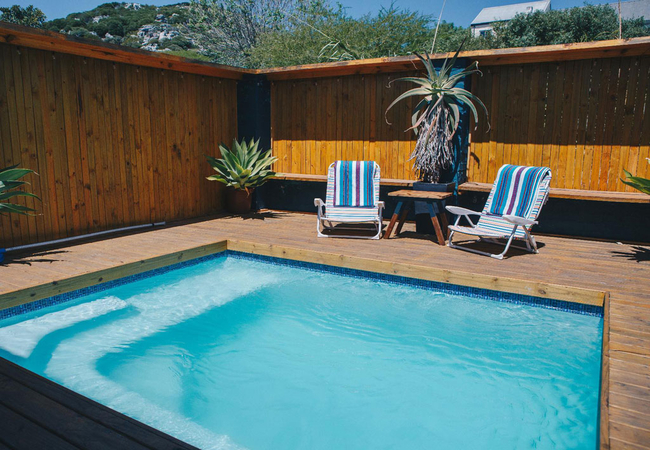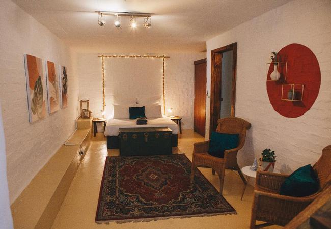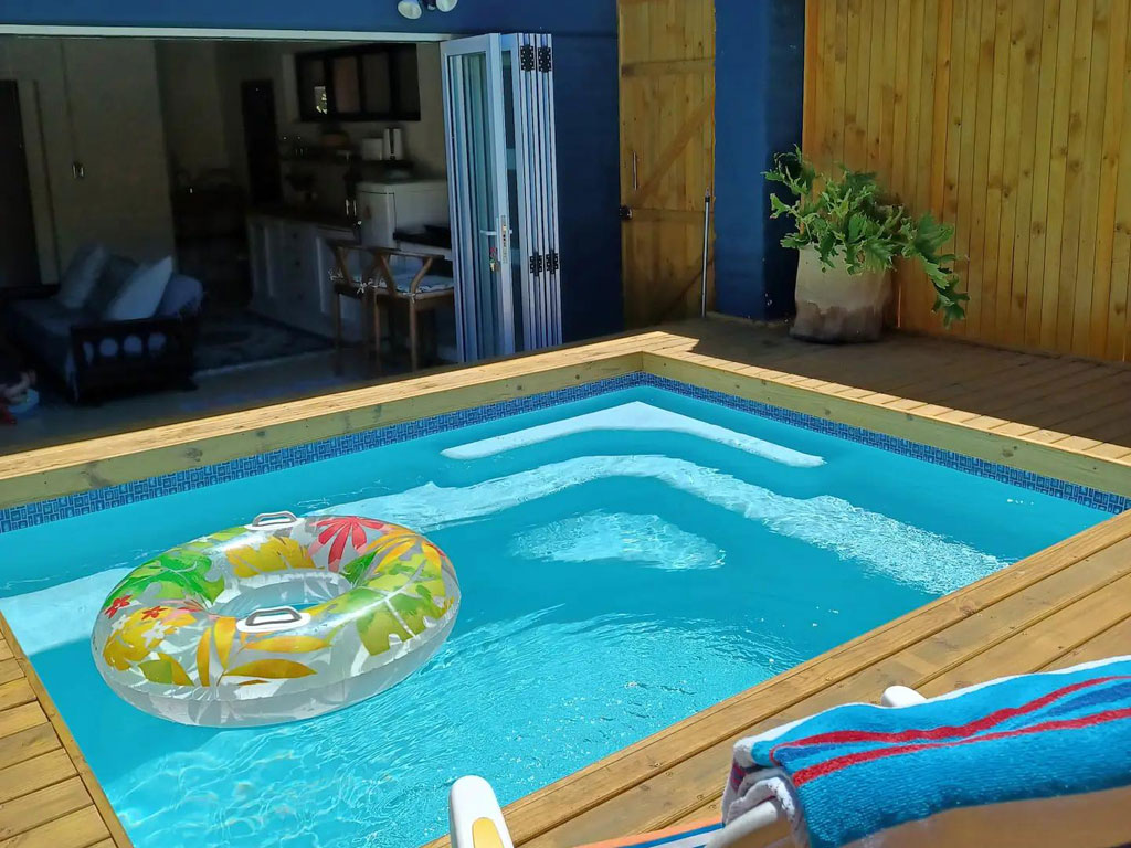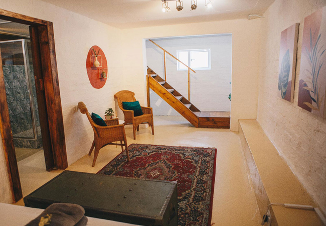 The Boho Cave is a boho styled garage conversion fit for Digital Nomads, single travellers and couples. The unit can accommodate up to two guests and comprises a bedroom downstairs furnished with a Queen-size bed. The bathroom is fitted with a shower, toilet and basin. This newly designed space also features an open plan kitchen and living area with stacking doors that open up onto a private deck with a plunge pool and braai corner. The Boho Cave has a staircase that may be steep and narrow for some guests.