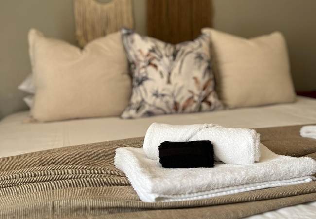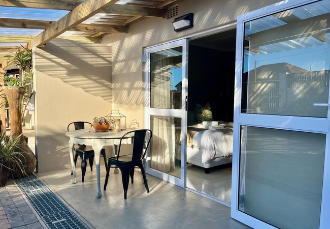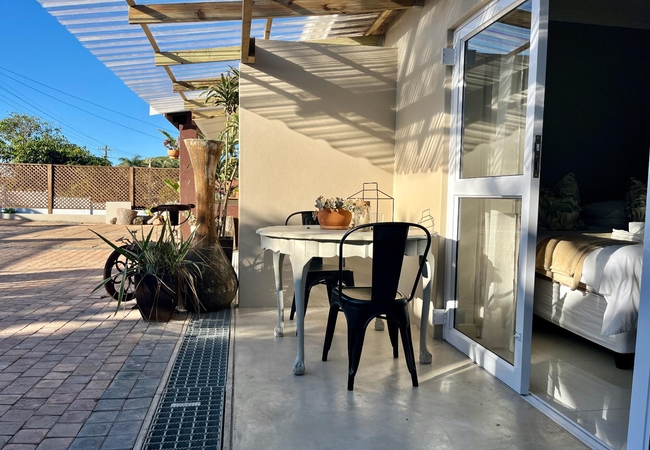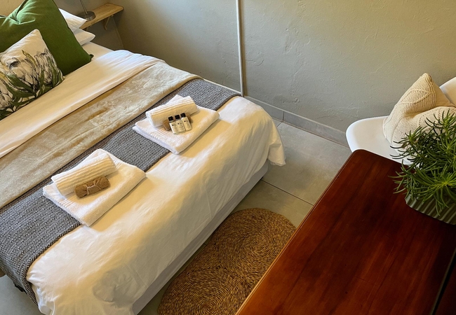The Boshoff Suite is a stylish, elegantly furnished room furnished with a double bed. The bathroom is fitted with a shower, toilet and basin. The suite has a kitchenette, smart TV and air conditioning and its own intimate patio/smoking area.