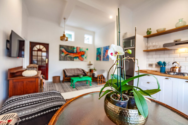 The open-plan kitchen is fully equipped with a gas stove, microwave, fridge-freezer, and an array of kitchenware, making self-catering both practical and enjoyable. In the living area, visitors will find a welcoming lounge with plush seating, a Smart TV, and complimentary Wi-Fi for added convenience.