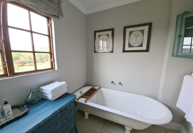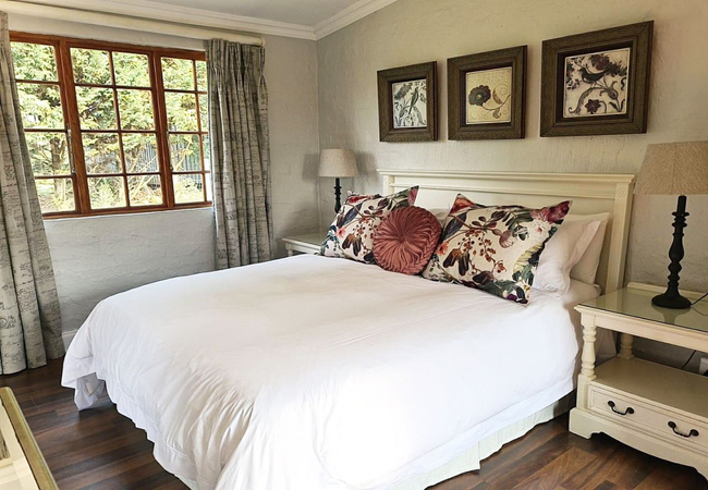 The Falls Cottage has a bedroom furnished with a Queen-size bed. The en-suite bathroom is fitted with a ball and claw bath, toilet and basin. The kitchen is equipped with a two-plate hob, fridge / freezer, microwave, kettle and toaster. There is a dining area with a round 4-seater dining table. The cosy lounge area contains a double fold-out sleeper couch, and a flat-screen TV with a selection of DStv channels and a DVD player. The cottage has a wood-burning fireplace, and firewood is provided throughout your stay. The cottage opens to a sheltered veranda with outdoor furniture and braai facilities. The accommodation is serviced daily. The garden is fully fenced allowing the cottage to be pet friendly by arrangement.