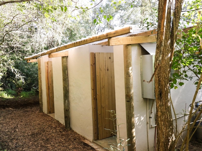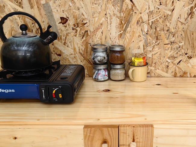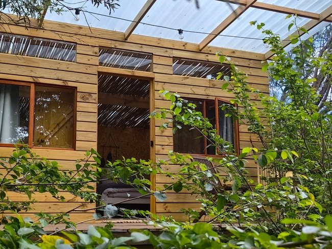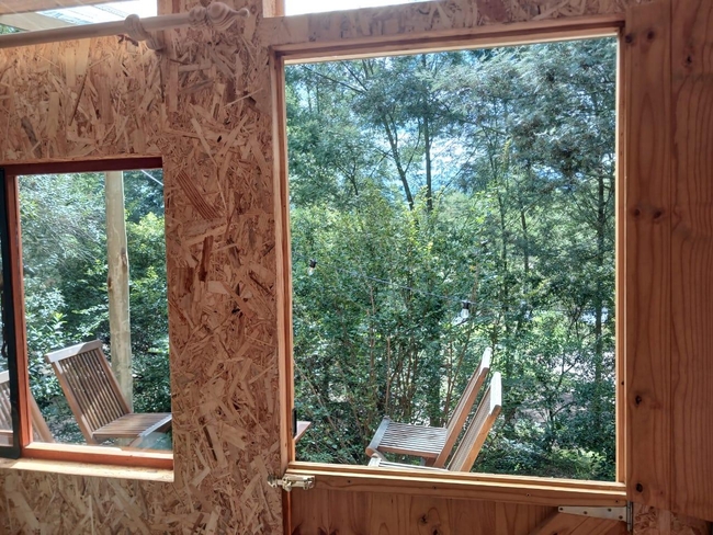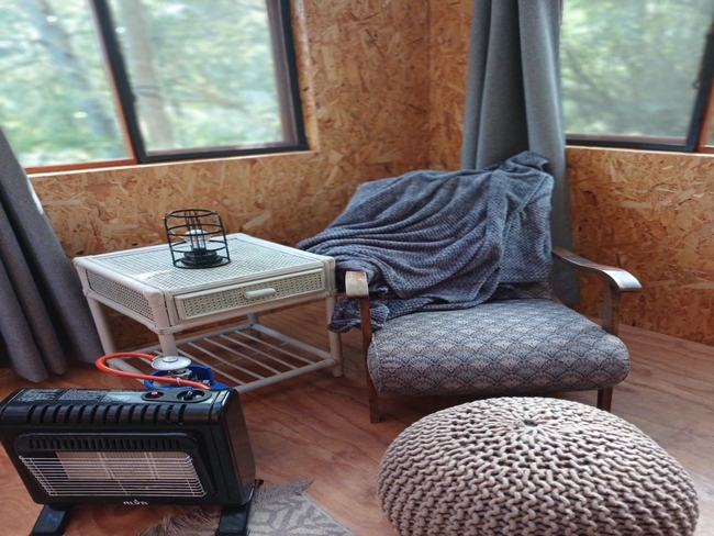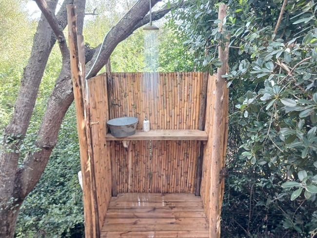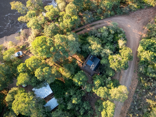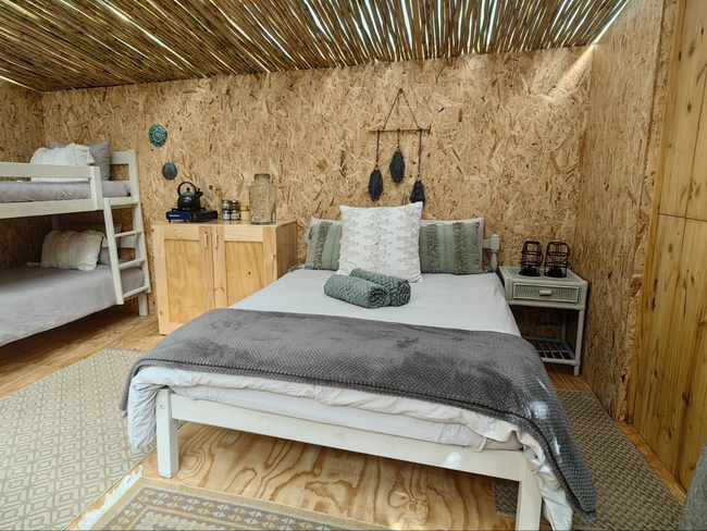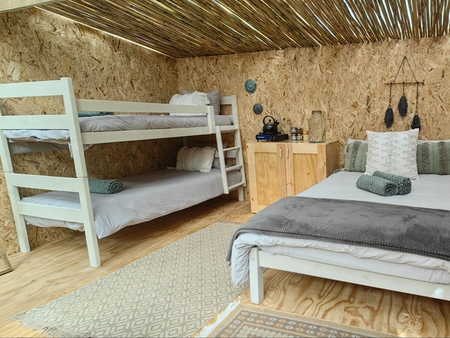 This off-grid, open-plan cabin is fully furnished and accommodates up to four guests, making it ideal for families. Inside, you will find a double bed and a bunk bed, along with a compact kitchenette that includes a single-plate gas cooker, crockery, and cutlery. A private black-pipe outdoor shower adds a rustic touch, while the nearby glampsite bathroom is equipped with a hot shower, a toilet, and a basin. The cabin opens onto a wooden deck with seating, offering beautiful views of the river. Although there is no electricity or plug points in the cabin, lighting is provided for convenience. Guests also have access to a communal glampdeck and outdoor kitchen, which features a three-plate gas cooker, a washbasin, a central dining table, and a braai area, with a larger firepit available for gatherings. The farm offers plenty of activities to enjoy, including scenic walks, birdwatching, canoeing, fishing, swimming in the river, paddle skis, a rope swing, and a jungle gym, ensuring a fun and memorable outdoor experience.