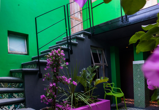 Attractive room full of light facing the stunning green Moroccan courtyard with banana trees. Queen-size bed, en-suite bathroom with shower, free high-speed Wi-Fi, minibar, TV, safe, air-conditioned. The charming rooms offer all you need from fridge to free high-speed WiFi and air-conditioning. Art from African photographers, selected vintage furniture, individual decorative items, queen-size beds and refreshing rain-showers with top cosmetics from Charlotte Rhys make our rooms become a little private wellness oasis.