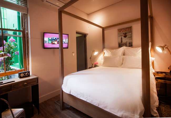 Beautiful sun-flooded room facing the vibrant streets of de Waterkant. Queen-size bed, en-suite bathroom with shower, free high-speed Wi-Fi, minibar, TV, safe, air-conditioned. The charming rooms offer all you need from fridge to free high-speed WiFi and air-conditioning. Art from African photographers, selected vintage furniture, individual decorative items, queen-size beds and refreshing rain-showers with top cosmetics from Charlotte Rhys make our rooms become a little private wellness oasis.