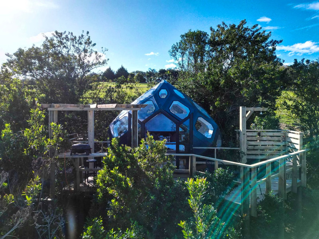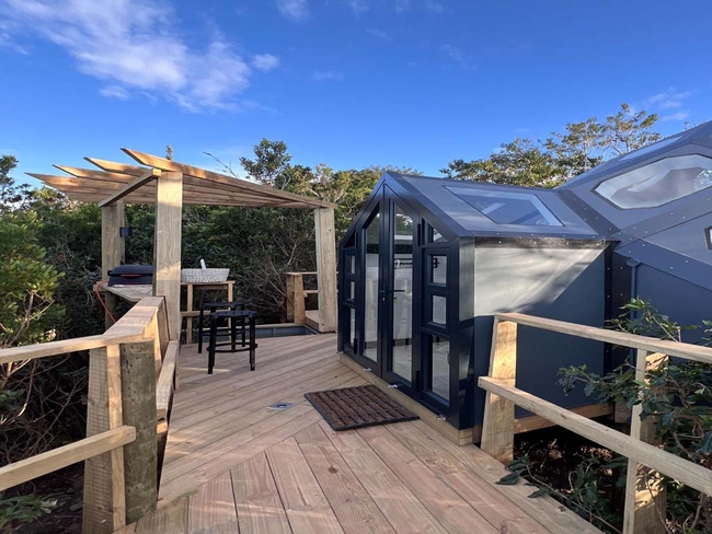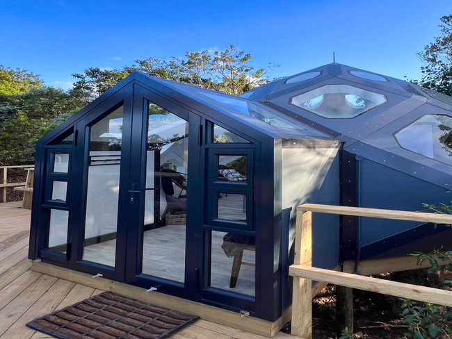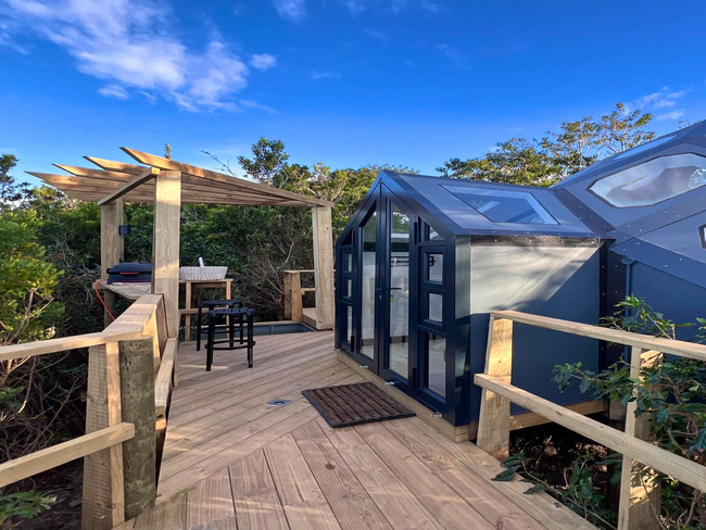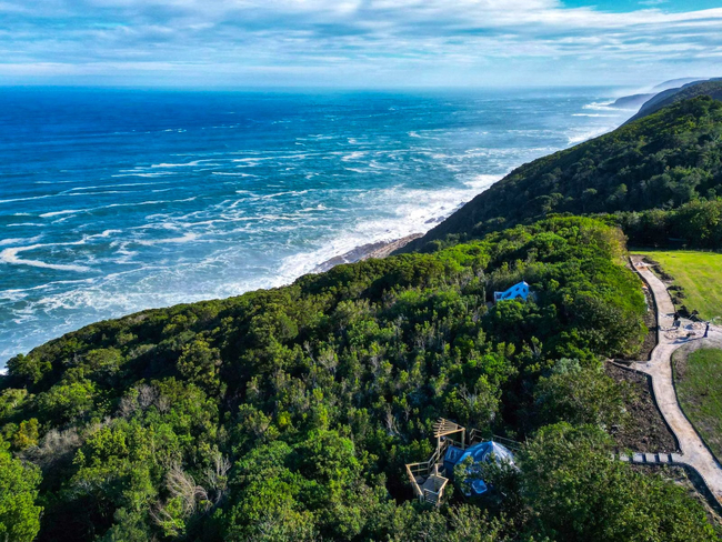 The Hive at Storm At Misty Mountain Reserve offers a stunning luxury tented retreat that boasts full-day security and an outdoor fireplace for guests' enjoyment.
