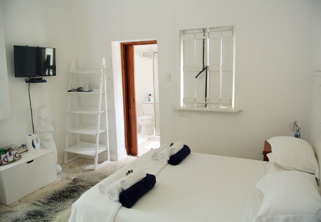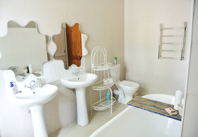 The Karoo Room has reed ceilings and is furnished with a double bed. Large doors open onto a stoep. The interior is decorated with Charmaine Haines art and there is a separate room just for the bath. Other facilities include a shower, toilet, electric blankets, a heater, fan, toiletries, a bathroom heater and heated towel rails.