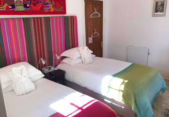 The Happy Room has two ¾ beds and is decorated in bright colours and themes from our travels in South America. The large bathroom has a double shower (two people can shower – each with separate controls and shower head). There is a ball-and-claw bath, under-floor heating, heated towel rails, a fan, electric blanket and more.