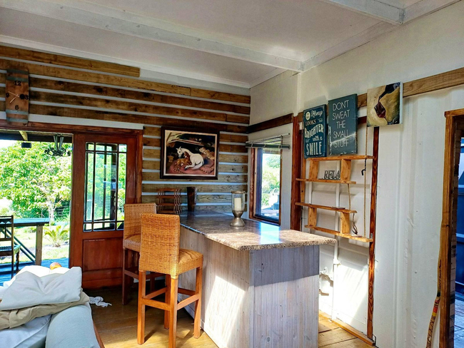 The kitchen is fully equipped for convenient self catering and features a fridge freezer, a four plate stove with oven, a microwave, as well as ample crockery and cutlery. The spacious living area creates a welcoming setting for relaxed evenings, complete with a wood fired pizza oven, a cosy bar corner, and a smart television with WiFi connectivity.
