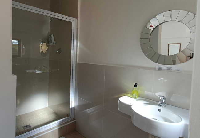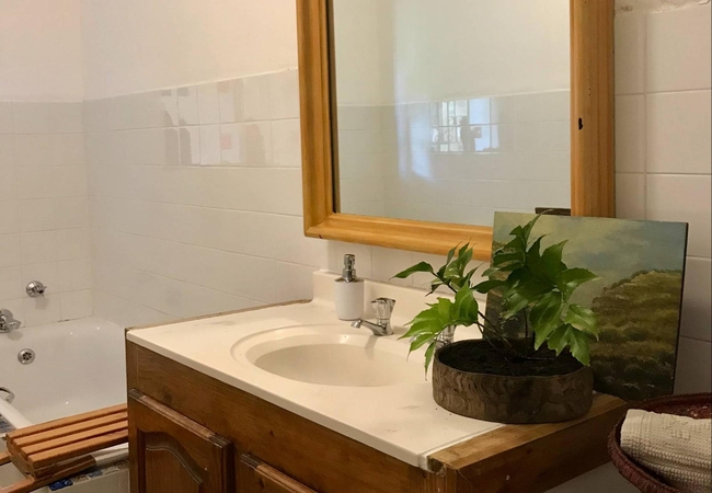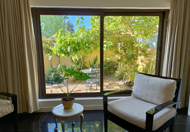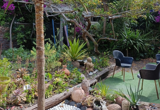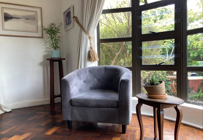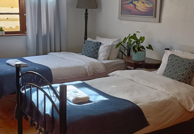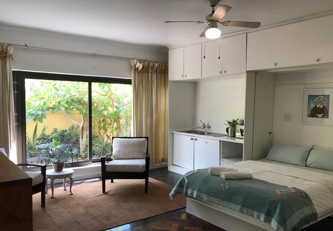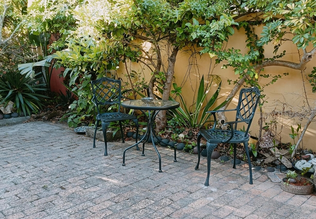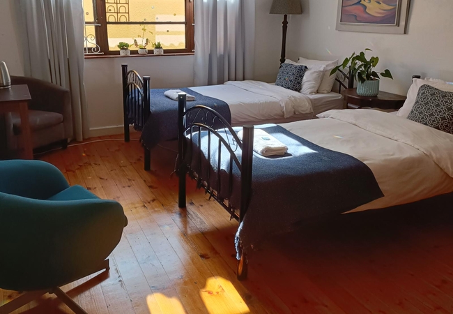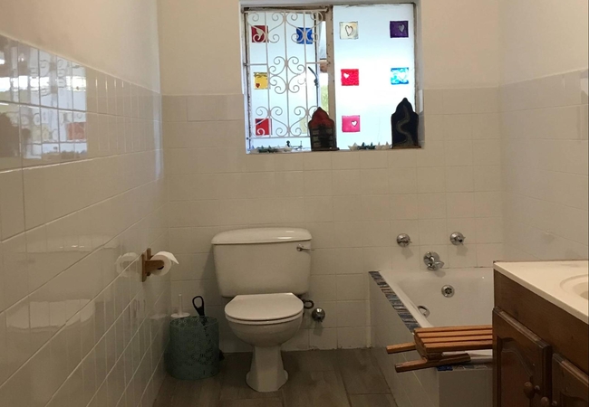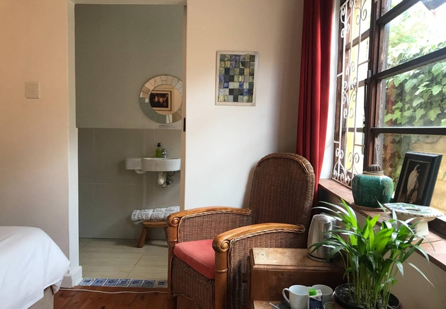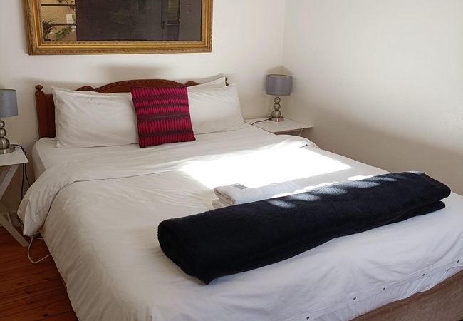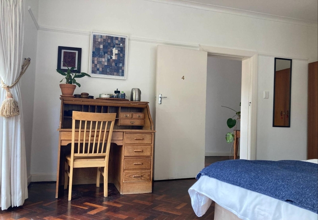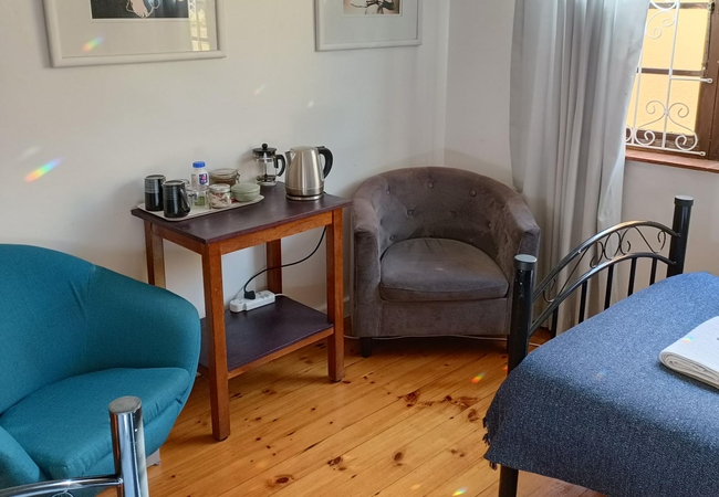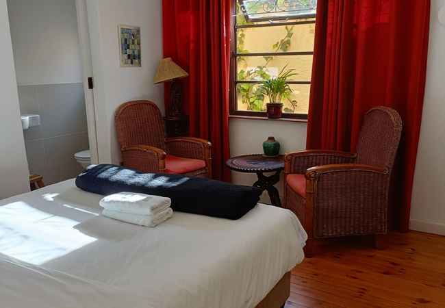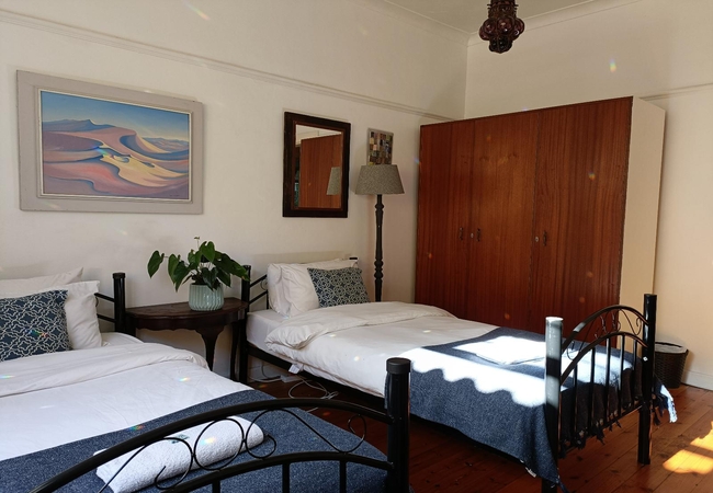 This room is furnished with twin beds and has access to a separate but private bathroom across the hall fitted with a shower, bath, toilet and basin. Guests are given a key to the bathroom which if for their exclusive use. There is a kettle, coffee plunger with fresh coffee and tea. Comfortable room decorated with unique artwork with double doors leading to quiet courtyard. On a quiet street in trendy Harfield Village. guests have use of a communal kitchen and patio.