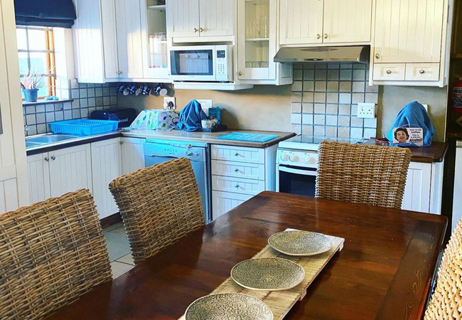 The Kaiha is a spacious, double storey house in Witsand with three bedrooms and two bathrooms. All bedrooms are on the first floor; two are furnished with a double bed and the third is furnished with two single beds. In addition, there is a double sleeper couch for two children. The bedrooms share two bathrooms; one is on the first floor and is fitted with a bath, toilet and basin. The second bathroom is on the ground floor and is fitted with a shower, toilet and basin. The open-plan kitchen is equipped with a fridge-freezer, gas stove, microwave, coffee machine and dishwasher. There is also a washing machine and ironing facilities for guests to make use of. Guests can enjoy their meals at the dining table and relax in the comfortably furnished lounge. Both an indoor and outdoor braai area is provided and the house has a playroom for children. Kaiha does not have a garage or driveway but parking for two vehicles is available in the complex parking lot.