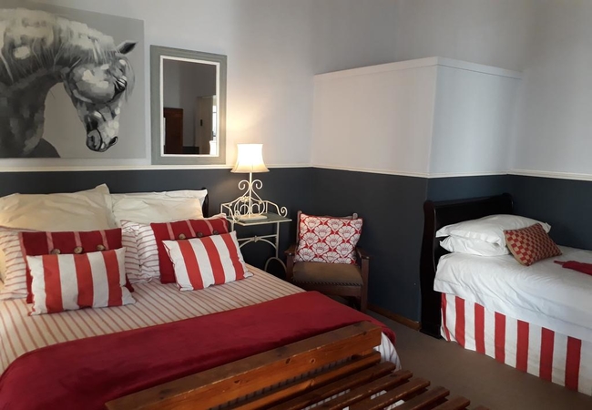 The Family Suite has two bedrooms ideal for a family or two couples. A spacious bathroom with a bath and shower, the main room has a queen-size bed, while the adjoining bedroom has two single beds and a cot. Lounge area with air-conditioning, TV with DStv and coffee and tea facilities.