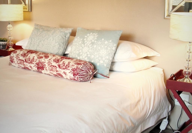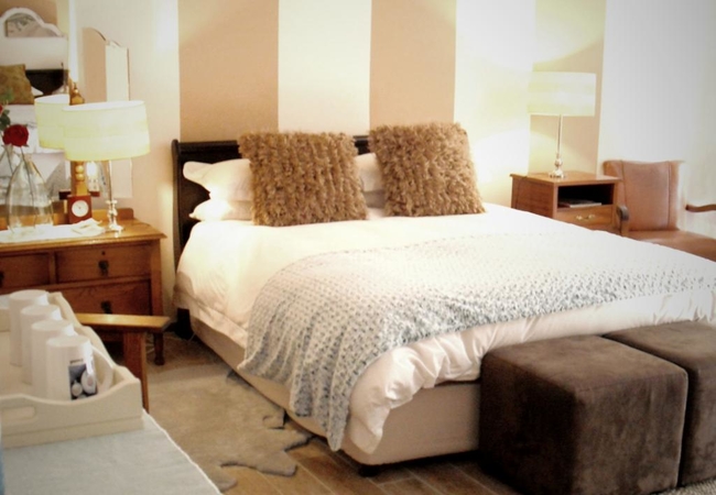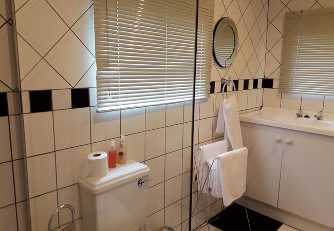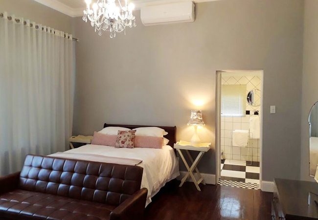 The Double Room En-Suite is furnished with a Queen-size bed. The en-suite bathroom is equipped with a bath and hand shower. This unit has a ceiling fan, TV and DStv and coffee and tea facilities available. All rooms have access to kitchenette facilities with tea, coffee and rusks, en-suite bathrooms and secure parking.