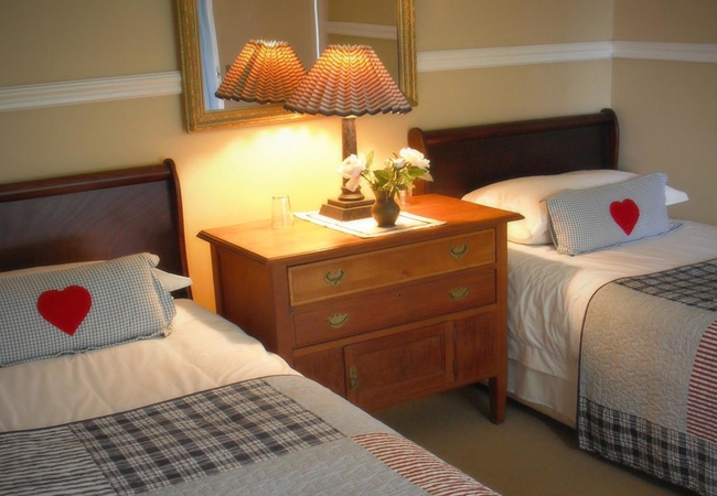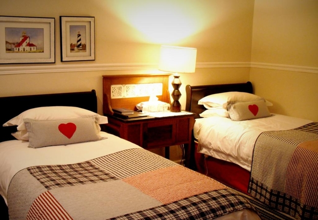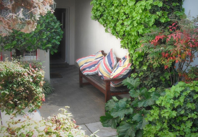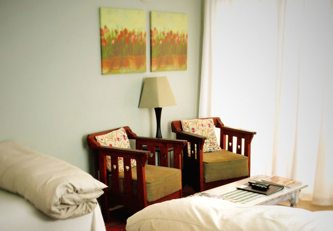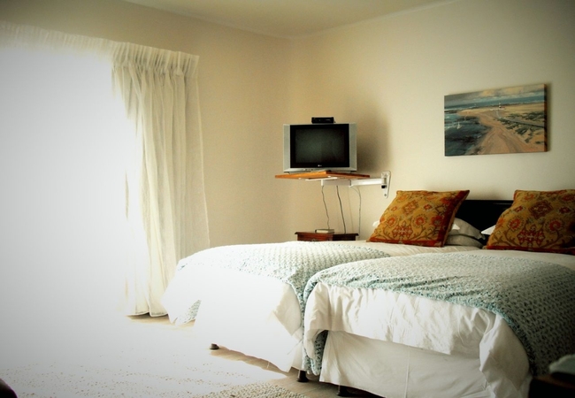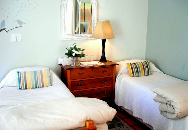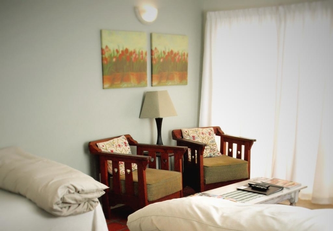 The Twin Room is furnished with two single beds with en-suite bathroom with a bath. A sliding door that leads into a tranquil garden setting. This unit has a ceiling fan, TV and DStv and coffee and tea facilities available. All rooms have access to kitchenette facilities with tea, coffee and rusks, en-suite bathrooms and secure parking.