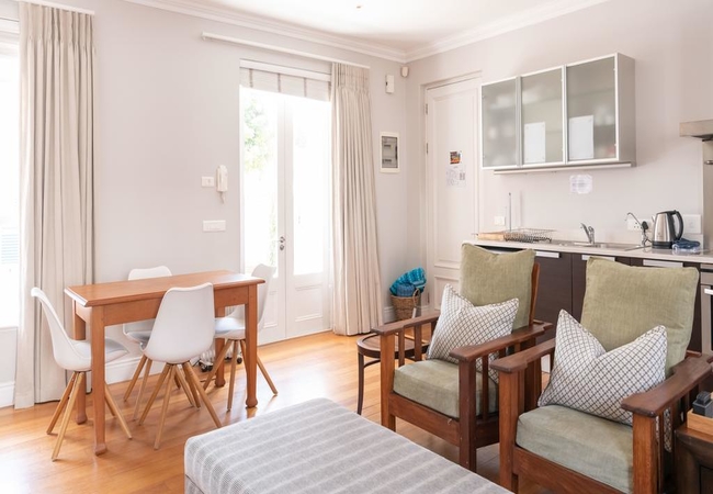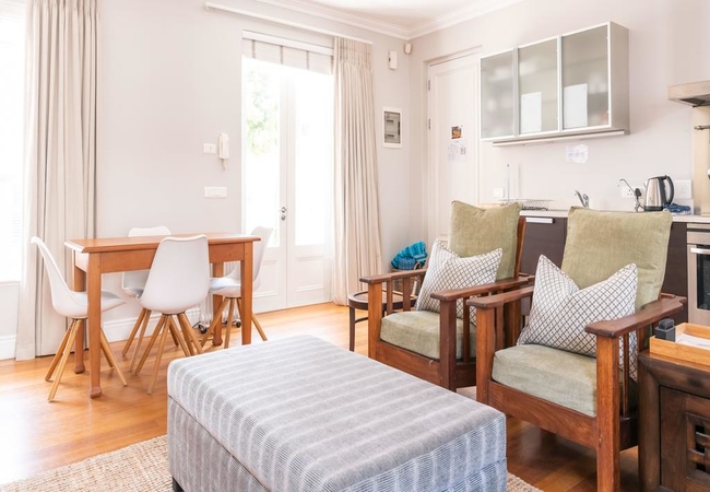 The Majestic Apartment is located inside the revitalised old Majestic Hotel. Tenants have exclusive access to a private gym, swimming pool and there is also a designated parking available. The Majestic Village has a 24 hour security system in place. The apartment is a luxurious one-bedroom apartment with a big living room, a kitchen and quaint little garden area on the ground floor without any views, situated in the heart of Kalk Bay in walking distance from the Kalk Bay Harbour. The Majestic Apartment is tastefully furnished and fully equipped to accommodate two people. Dining area with Satellite TV (open plan), full alarm system, rooms serviced daily, outside garden, satellite TV, dining table, hairdryer, safe, quality fresh linen and towels and cupboard and chest of drawers.