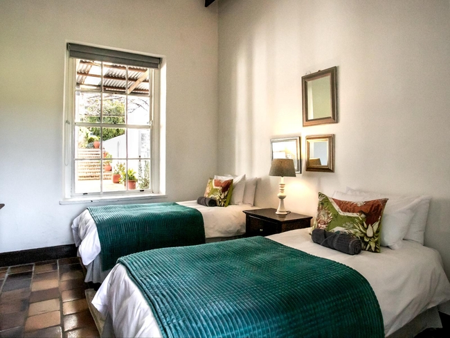 The West wing of the house also has two bedrooms, one furnished with a queen bed and one furnished with one single and a bunk bed. These bedrooms share the en-suite bathroom of the main bedroom. The main bedroom has a door with its' own access onto the front stoep. The bathroom is fitted with a bath, shower and bidet. A large lounge with fireplace and a door leading to the front stoep divides the two living areas of the main house. Comfortably furnished with leather couches, complete with flat screen television and full DSTV. There is a well-stocked bookshelf with books to suit any taste for guests to enjoy. If you take one, we only request that you leave a book in its place. The large farmhouse kitchen and dining area is fully equipped and opens onto the outside seating area. There is a gas stove, electric oven, microwave, dishwasher and washing machine. It has a wonderful outside area with barbeque facilities and a private swimming pool.