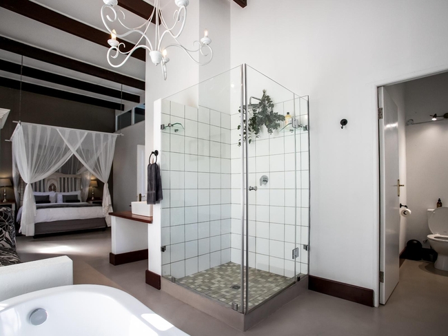 The West wing of the house also has two bedrooms, one furnished with a queen bed and one furnished with one single and a bunk bed. These bedrooms share the en-suite bathroom of the main bedroom. The main bedroom has a door with its' own access onto the front stoep. The bathroom is fitted with a bath, shower and bidet.