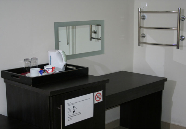 En-suite shower, bar fridge and tea facilities, air-conditioning, built-in wardrobes, TV with SABC / MNET and DSTV channels. The Guest House offers accommodation in five comfortable suites, each with a double bed, an en-suite bathroom, air conditioning, a TV with DStv and tea / coffee making facilities.
