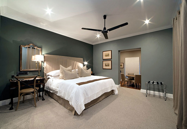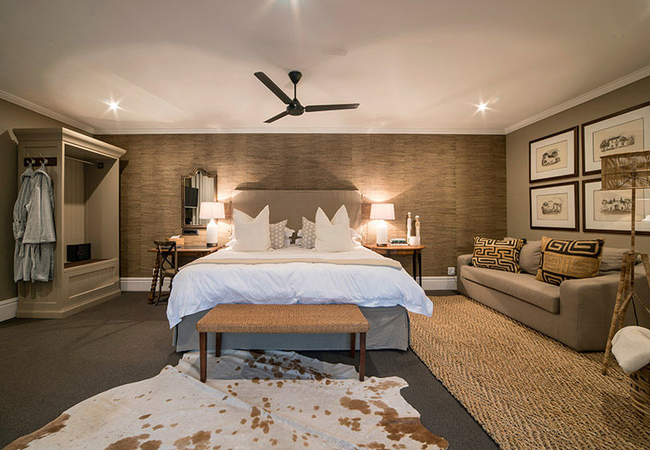 Luxury suite furnished for uncompromising levels of comfort with an extra length super king-size bed and a fireplace. French doors open onto a quaint verandah overlooking the garden. Huge bathroom with free standing bath, roomy walk-in shower and twin basins.