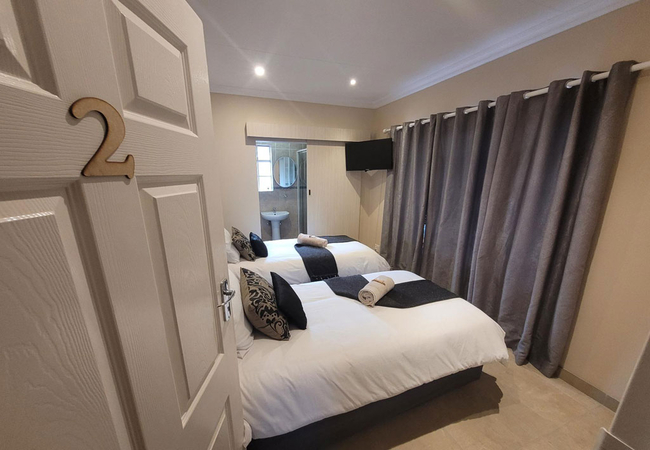 Room 2 is furnished with a two single beds and an en-suite bathroom fitted with a shower, toilet and basin. The room is equipped with a flat screen Smart TV with Netflix and YouTube, Wi-Fi and tea / coffee making facilities. Rooms have access to a guest lounge and communal kitchen.