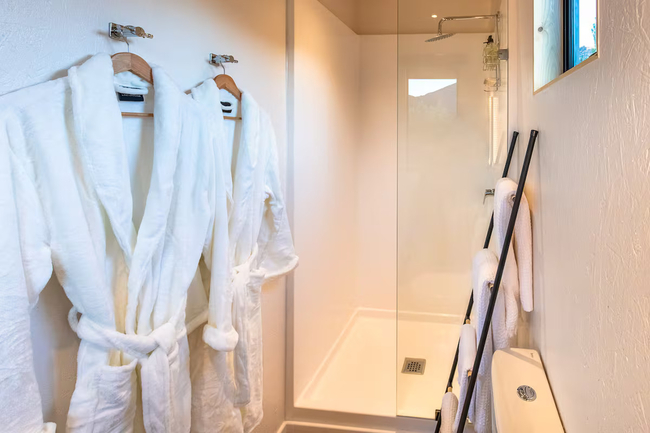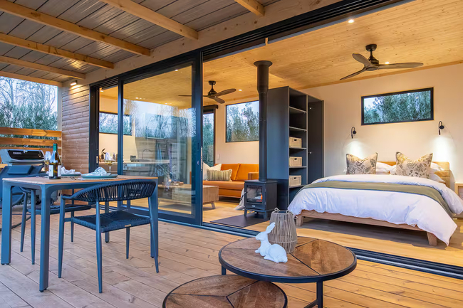 Inside, the space is thoughtfully appointed with modern conveniences including Wi-Fi, a comfortable sitting area, a dining table, and a fireplace complemented by both ceiling and portable fans for year-round ease. Added comforts include electric blankets, hypoallergenic pillows, and well-considered bathroom features such as a walk-in shower, soft bathrobes, and a hairdryer.
