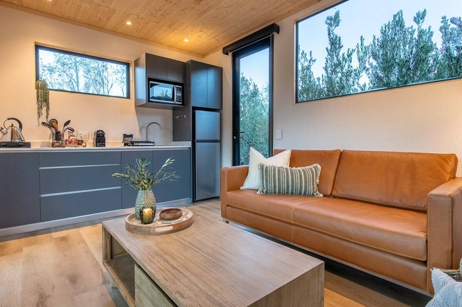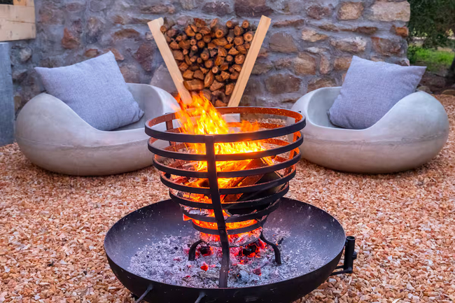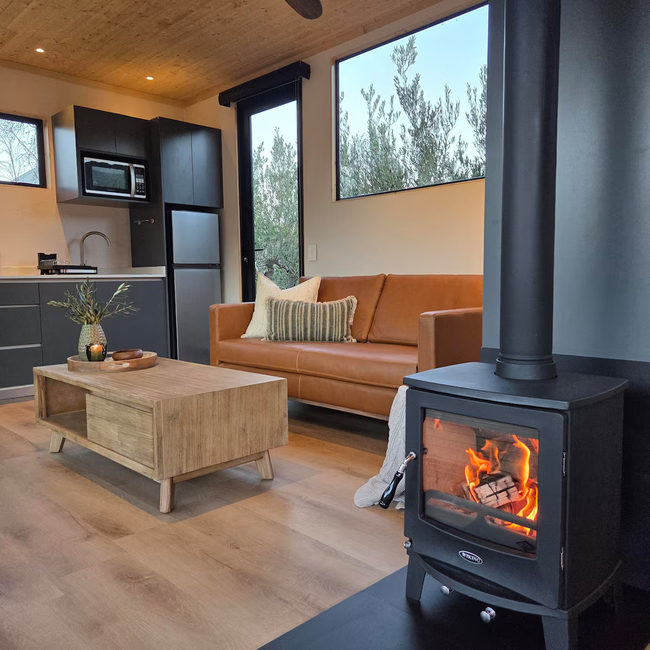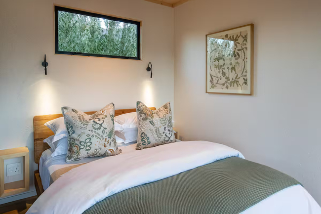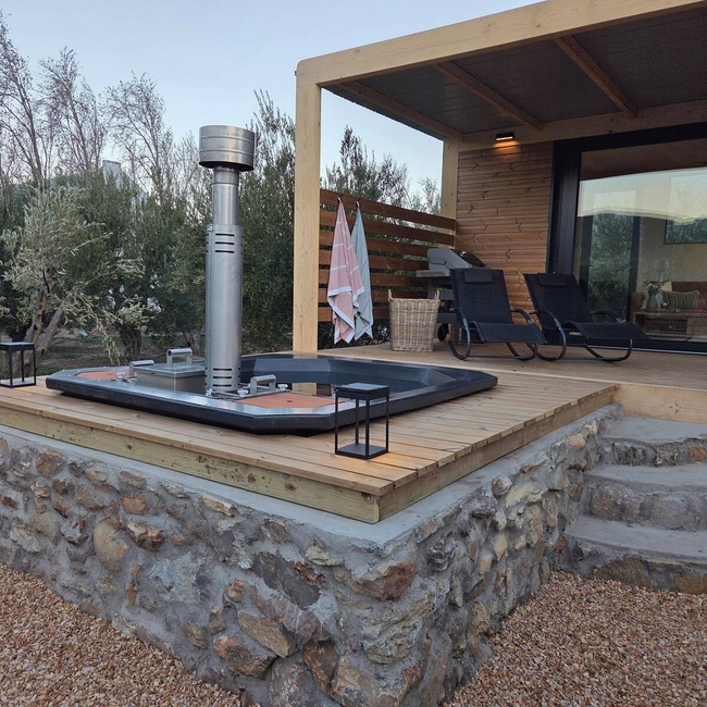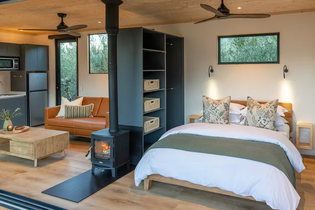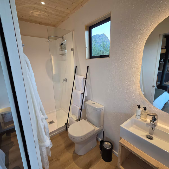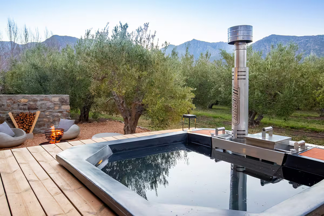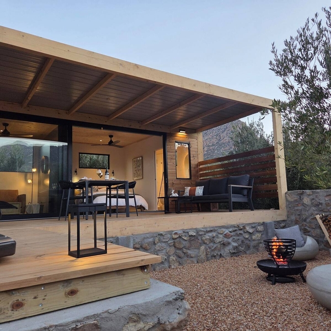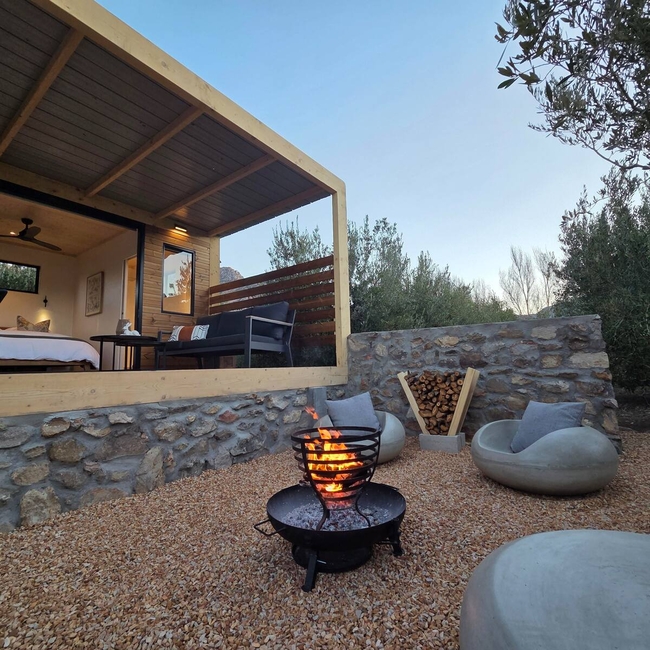 Among the olive groves with uninterrupted views of the mountains, the Olive Pod provides a private escape designed for couples or solo travelers who appreciate style, comfort, and tranquillity. The retreat embraces eco-friendly principles while blending minimalist design with luxurious details, offering a refined yet uncomplicated stay. Inside, the space is thoughtfully appointed with modern conveniences including Wi-Fi, a comfortable sitting area, a dining table, and a fireplace complemented by both ceiling and portable fans for year-round ease. Added comforts include electric blankets, hypoallergenic pillows, and well-considered bathroom features such as a walk-in shower, soft bathrobes, and a hairdryer. A compact yet practical kitchenette is equipped with a refrigerator, microwave, toaster, two-plate stove, and coffee and tea-making facilities, ensuring everything needed for a relaxed stay. Stepping outside, guests will find a private garden framed by mountain views. The hot tub offers the perfect place to unwind, while the outdoor dining space and braai facilities provide the opportunity to enjoy long, leisurely meals. Comfortable seating completes the setting, inviting quiet afternoons or evenings under the starlit sky.