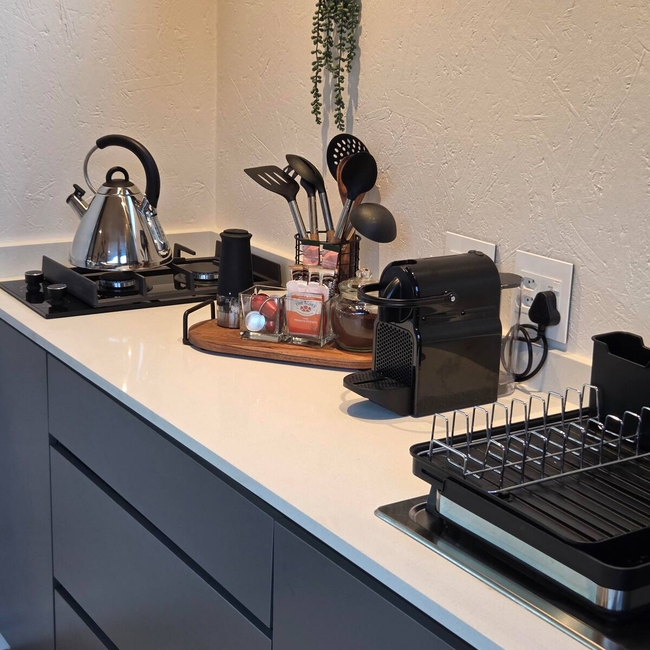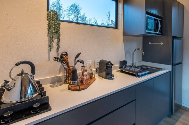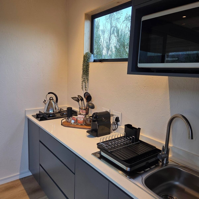 A compact yet practical kitchenette is equipped with a refrigerator, microwave, toaster, two-plate stove, and coffee and tea-making facilities, ensuring everything needed for a relaxed stay.