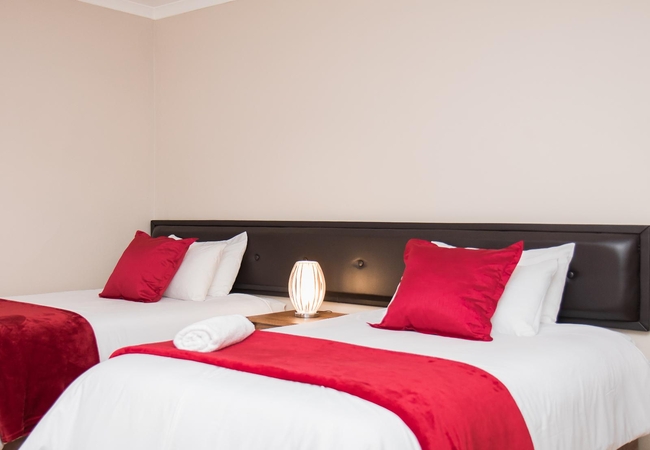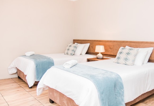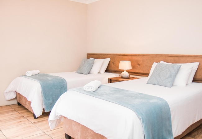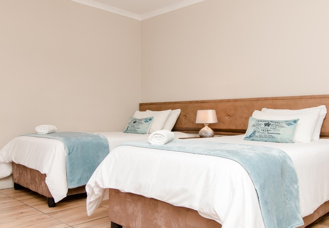 The room has three three-quarter beds and comprises of an en-suite bathroom with a shower and a kitchenette. The room is equipped with a TV with selected DStv channels, a bar fridge, air-conditioning, and has access to a private courtyard with braai facilities.