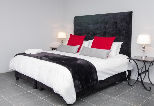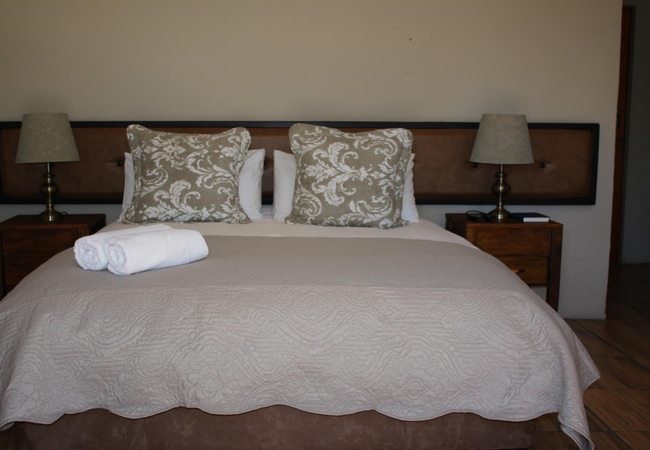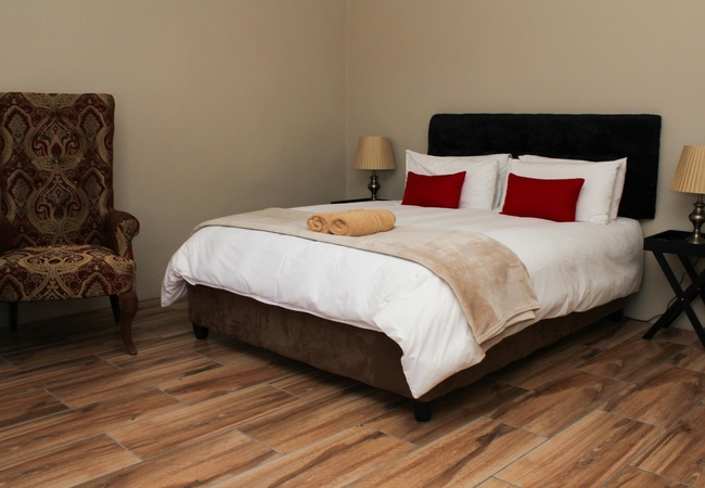 The room comprises an queen-size bed and a single bed, an en-suite bathroom with a shower, and a kitchenette. The room is equipped with a TV with selected DStv channels, a bar fridge, air-conditioning, and has access to a private courtyard with braai faci