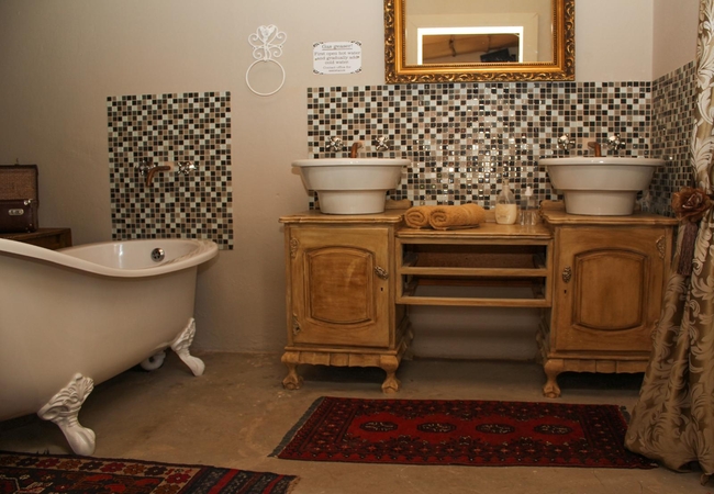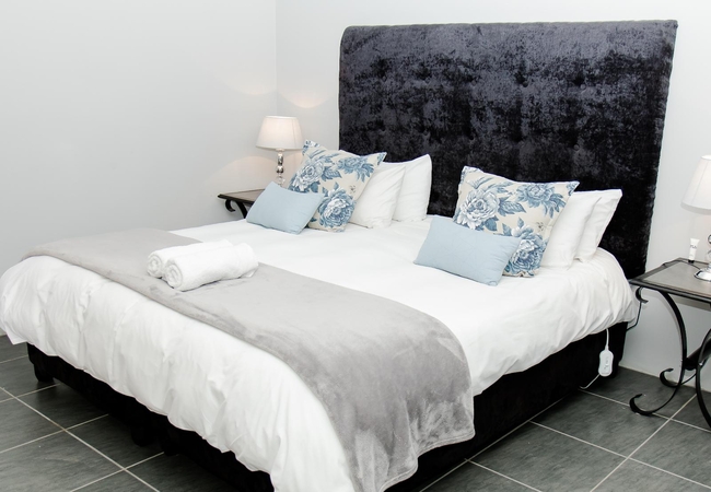 The room comprises a queen-size bed, an en-suite bathroom with a Victorian bath, and a mini kitchen. The room is equipped with a TV with selected DStv channels, WiFi, air-conditioning, a bar fridge, a toaster, and tea- and coffee-making facilities.