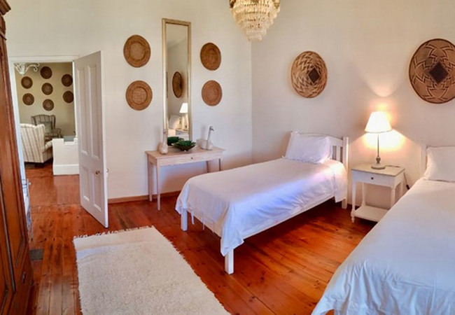The Poplars is a beautifully restored traditional farmhouse that seamlessly blends elegance with luxury, making it the perfect retreat for a large family. Accommodating up to ten guests, the home features five thoughtfully designed bedrooms, ensuring comfort and privacy. The main bedroom is furnished with two single beds and includes an en-suite bathroom with a shower, toilet, and basin. The second bedroom boasts a king-size bed and an en-suite bathroom with a shower, toilet, and basin. The third and fourth bedrooms each have two single beds and share a passageway bathroom fitted with a bath, shower, toilet, and basin. The fifth bedroom features a king-size bed and an en-suite bathroom with a bath, shower, toilet, and basin. Quality linen and towels are provided for a hassle-free stay. The well-equipped kitchen includes a fridge-freezer, gas stove, oven, microwave, and essential cutlery, crockery, and tea- and coffee-making facilities. The spacious living room offers ample, comfortable seating and opens onto a charming patio with braai facilities and a classic farm-style pool, perfect for outdoor relaxation. Outside you will find another dining area and patio furniture as well as a lovely swimming pool where you can cool off from the Karoo heat.
