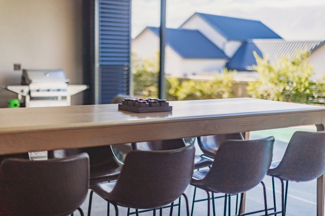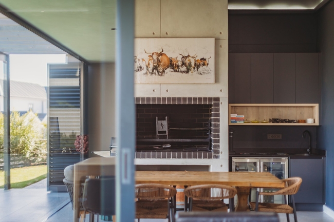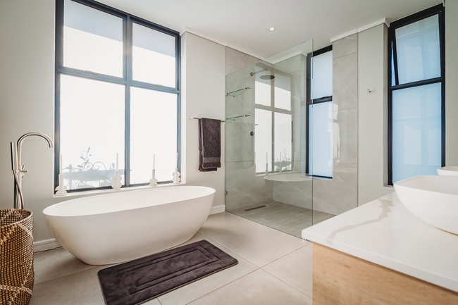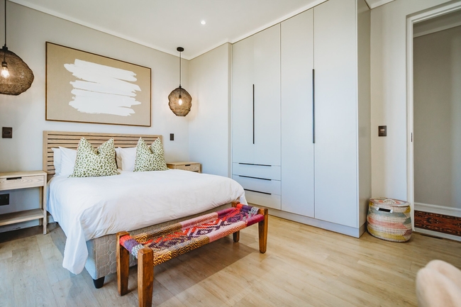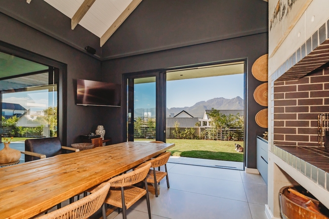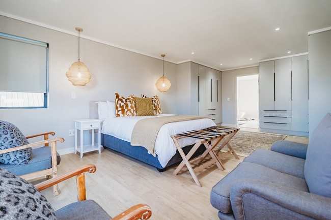 This well appointed home features three bedrooms and three bathrooms, comfortably accommodating up to six guests. The main bedroom is furnished with a king-size bed, while the second bedroom offers a queen-size bed and a private en-suite bathroom fitted with both a bath and a shower. The third bedroom includes a double bed, and the guest bathroom is equipped with both a bath and a shower. An additional third bathroom provides a shower only. The open-plan living area comprises a dining space with a table and chairs, a fireplace, and a comfortable lounge furnished with plush seating and a television. The fully equipped kitchen includes a double-door fridge-freezer, gas stove, oven, dishwasher, and microwave, ensuring convenience for extended stays. A washing machine and tumble dryer are also available for guest use. Outdoor living is enhanced by a covered patio, ideal for relaxed al fresco dining, as well as a swimming pool for refreshing leisure. Braai facilities and secure on-site parking further contribute to a comfortable and enjoyable stay.
