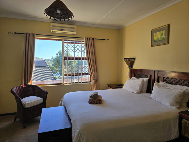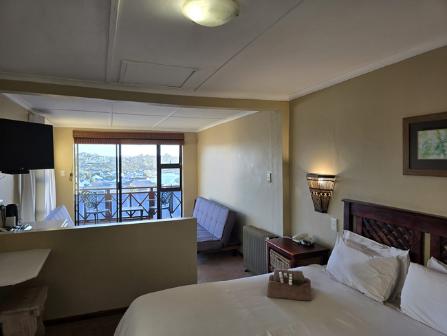 The Executive Room has a Queen-size bed and an en-suite with a shower. There is a separate lounge area with private balcony and stunning views. The room has a flat screen TV with selected DStv channels and a stocked mini-bar. Tea/coffee facilities as well as towels, gowns and slippers are provided.