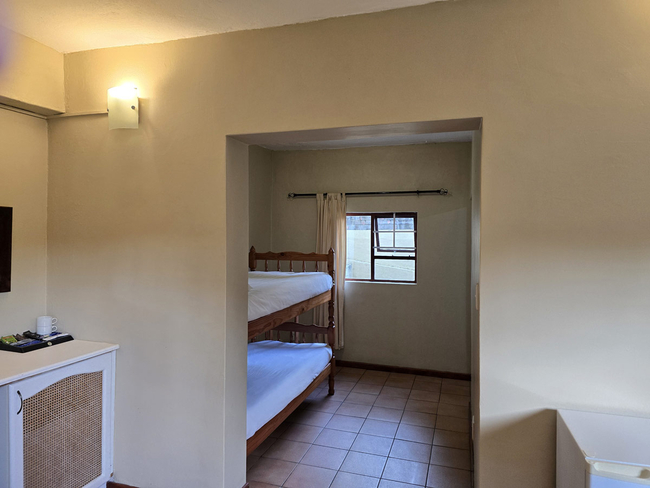 The Family Room has a Queen-size bed with twin bunk beds or a King-size bed or twin beds. There is a separate lounge with a pull out bed. The bathroom is an en-suite with a shower or an en-suite bathroom with a corner-style bath and separate shower. There is a flat screen TV with selected DStv channels and a stocked mini-bar. Tea/coffee facilities as well as towels, gowns and slippers are provided.