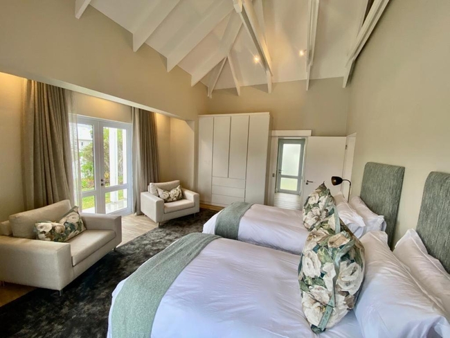The main suite is elegantly furnished with a king-size bed and a spacious en-suite bathroom fitted with both a bath and a separate shower. The second and fourth bedrooms each include twin beds with modern en-suite shower rooms, while the third bedroom is equipped with a queen-size bed and its own en-suite shower. The fifth bedroom, located within the separate flatlet, features a queen-size bed, compact kitchenette, and private en-suite shower, providing a comfortable retreat for guests seeking privacy.
