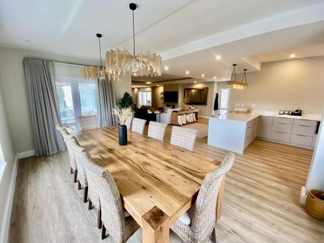 The villa’s kitchen is fully equipped with premium appliances and includes a dining area designed to seat ten guests with ease. A scullery and laundry area are conveniently located nearby for added practicality. The open-plan lounge and dining room blend seamlessly, enhanced by a pool table and a spacious enclosed entertainment area that invite guests to unwind and socialise in comfort.