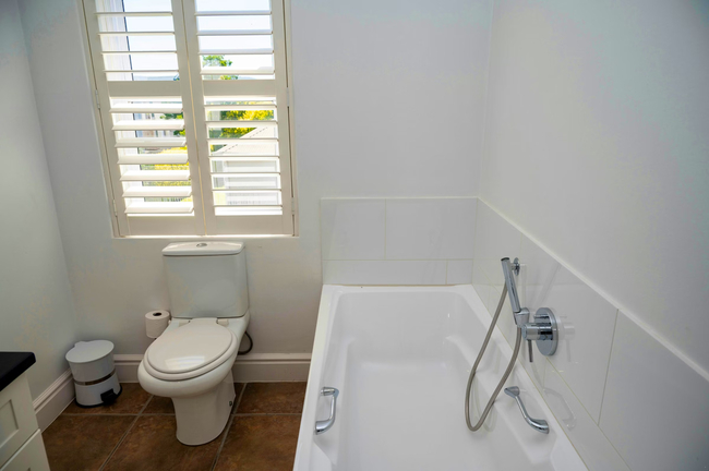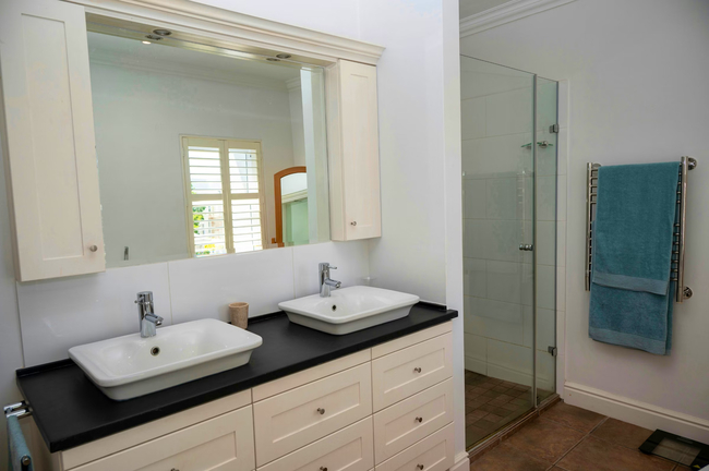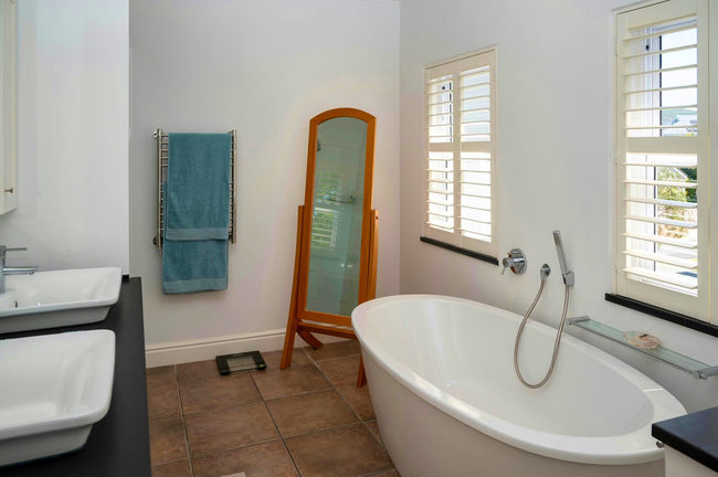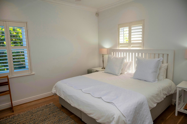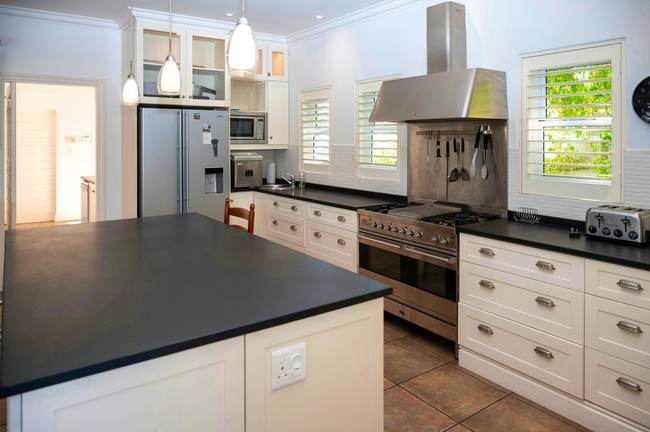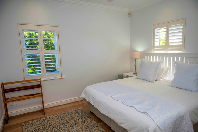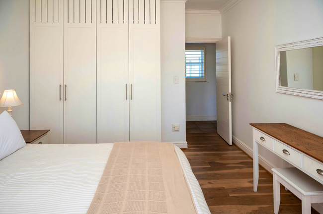 The villa comfortably accommodates up to eight guests across four elegantly appointed bedrooms and three bathrooms. The master suite features a king-size bed and a private en-suite bathroom complete with a bath, shower, basin, and toilet. The second bedroom offers the flexibility of a king-size or twin beds and has its own en-suite bathroom with a shower, basin, and toilet. The third bedroom is furnished with a queen-size bed, while the fourth bedroom contains two single beds; these two rooms share a well-equipped guest bathroom that includes a bath, shower, basin, and toilet. All bedrooms are supplied with fresh linen and towels for guest convenience. The fully equipped kitchen includes a fridge-freezer, stove, oven, air fryer, microwave, dishwasher, and all necessary cutlery, crockery, and tea- and coffee-making facilities. It opens onto a comfortable lounge area with plush seating, a television, and a dedicated dining space, creating a seamless environment for socialising and relaxation. Stepping outside, guests will find a charming patio with outdoor seating and a built-in braai, perfect for entertaining, while the sparkling swimming pool adds a touch of leisure and luxury.