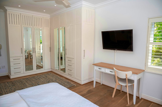 The villa comfortably accommodates up to eight guests across four elegantly appointed bedrooms and three bathrooms. The master suite features a king-size bed and a private en-suite bathroom complete with a bath, shower, basin, and toilet. The second bedroom offers the flexibility of a king-size or twin beds and has its own en-suite bathroom with a shower, basin, and toilet.