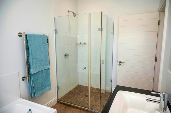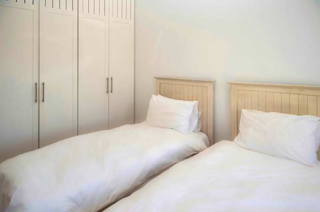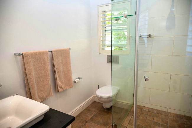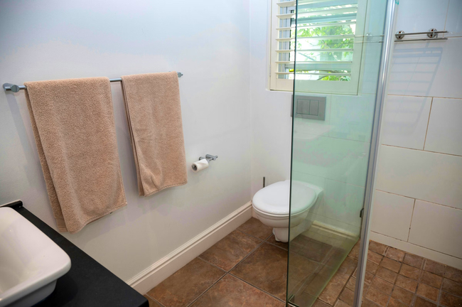 The third bedroom is furnished with a queen-size bed, while the fourth bedroom contains two single beds; these two rooms share a well-equipped guest bathroom that includes a bath, shower, basin, and toilet. All bedrooms are supplied with fresh linen and towels for guest convenience.