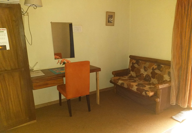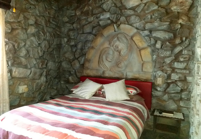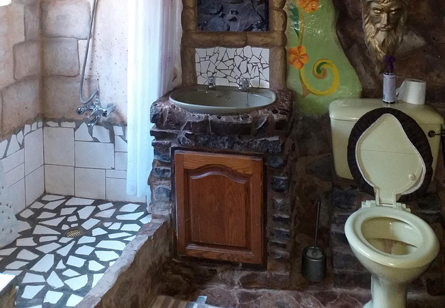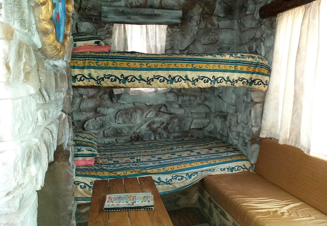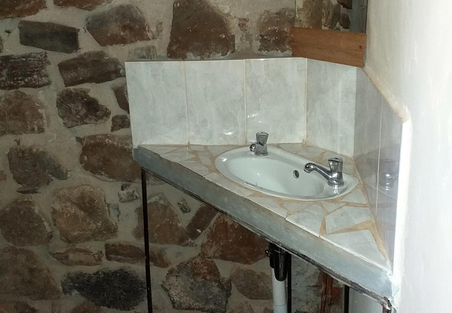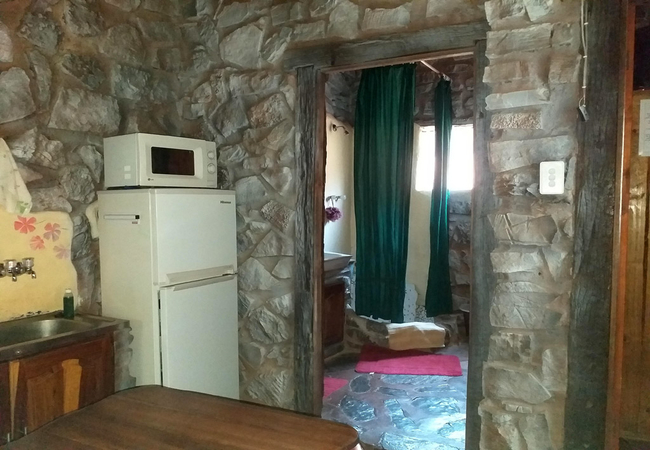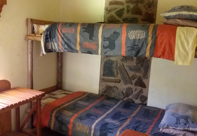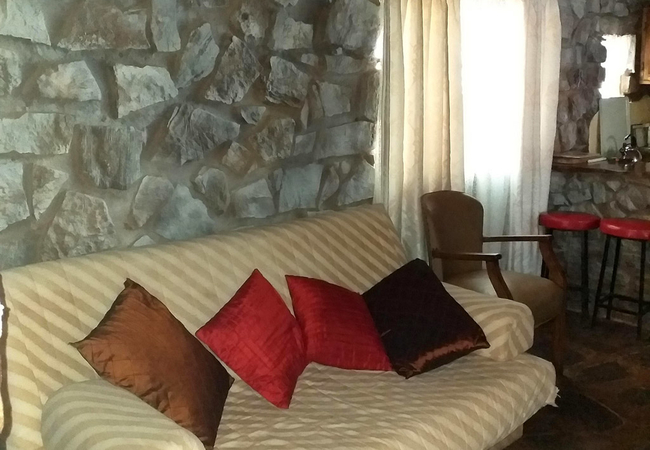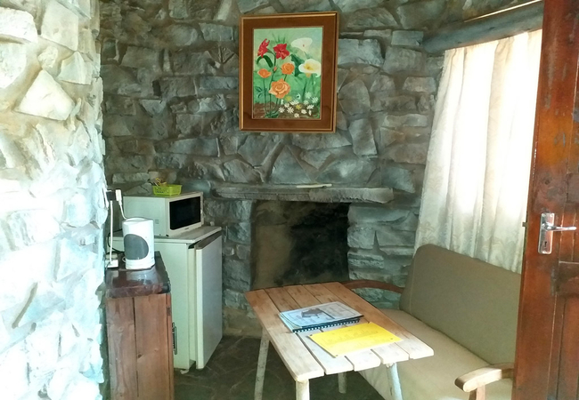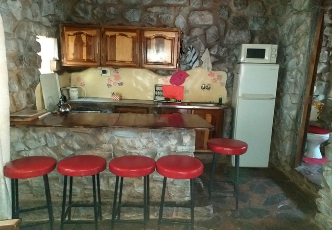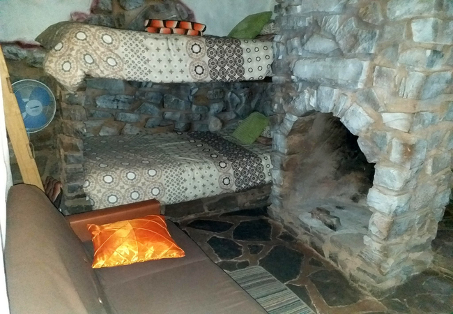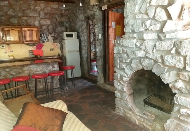 This chalet features one bedroom with a double bed and two single beds stacked up on each other. The enitre unit is small and open plan with full kitchen. OVHD Decoder connected to the TV. The chalet also includes an indoor wood fireplace for the winter and ceiling fans for the summer. Features: Double beds, Private bathroom, Fireplace, Bunk beds, Garden views, Fan, Television, Tea and Coffee Facilities, No Smoking in Rooms. Access to open air cold water swimming pool.