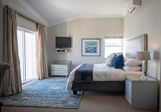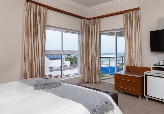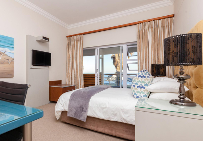 This is a superior en-suite room opening onto an upstairs balcony with stunning views of the Atlantic Ocean and Robben Island. The balconies have privacy partitions. This room has a Queen-size bed. All the rooms have en-suite bathrooms with a shower, air conditioning, TV with satellite channels, Wi-Fi, tea / coffee trays, hairdryer, safe, bar fridge and luxurious bathroom amenities.