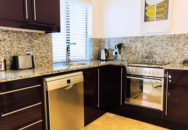 Open plan kitchen and lounge finished in natural slate with patio doors opening out onto an elevated private terrace overlooking gardens and pool. Two large bedrooms both with en-suites, fully fitted kitchen with granite worktops. Serviced daily.