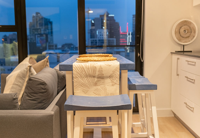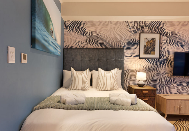 This studio apartment sanctuary is designed for two occupants seeking an unparalleled urban retreat. The living space boasts a comfortable lounge area, and the fully equipped kitchen features modern appliances, including a fridge, microwave, washing machine, oven, stove, and kettle.