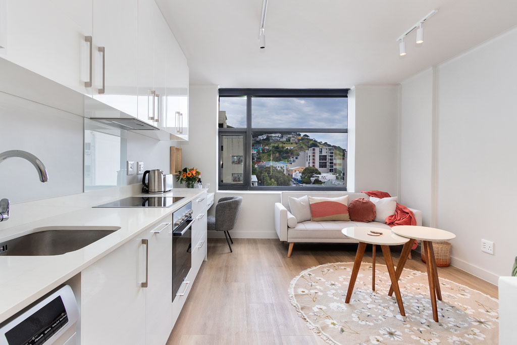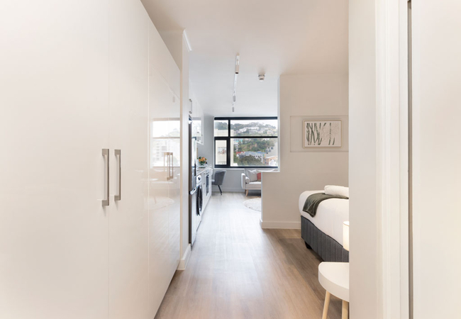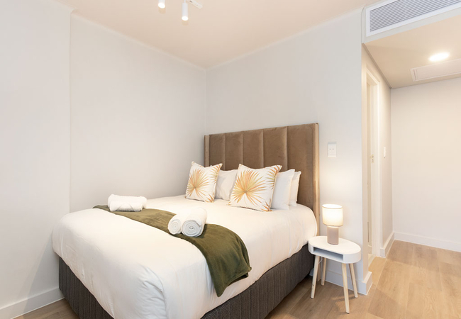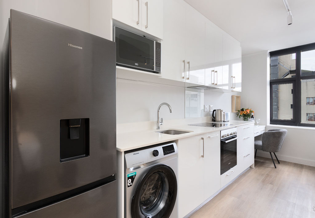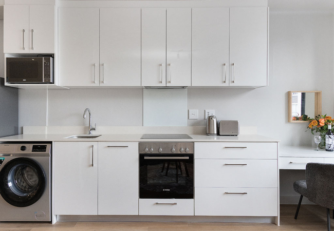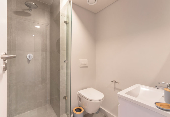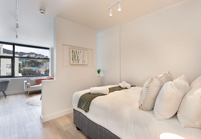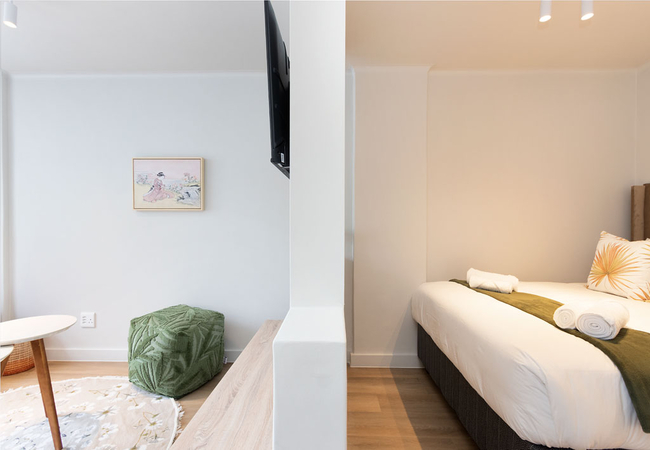 The Tokyo 701 is an apartment in Cape Town Central. The bedroom area furnished with a Queen-size bed. A wall divides the bedroom from the living room and kitchen. The bathroom is fitted with a shower, toilet and basin.