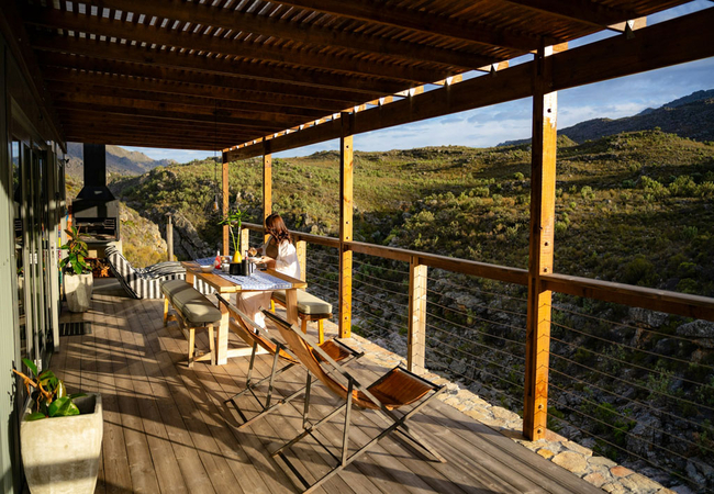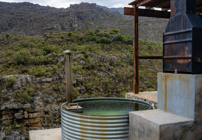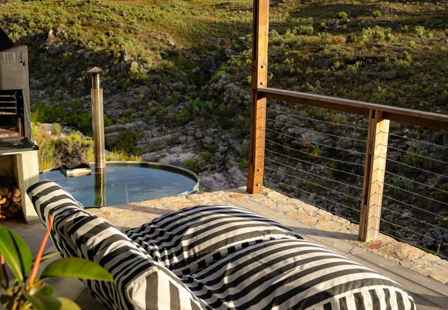 The outside deck has a built in braai and a wood fired hot tub. Two bags of firewood are supplied per night and additional firewood is available at the store which also has Vodacom reception.