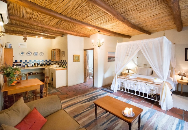 The unit consists of an open plan living / lounge area with a sofa set, yellowwood dining table, antique French wardrobe and has a beautiful queen-sized, extra length 4-poster bed. The fully equipped kitchenette is perfect for light meals and is equipped with a microwave, hot plate, kettle, toaster and fridge. The charming en-suite bath and shower room is decorated with handmade blue-and-white tiles, and Victorian finishes. The extra length bath is perfect for winter soaks, and the separate open shower is ideal for cooling off in the summer.