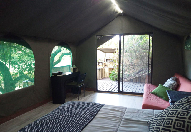 The Lodge tent is furnished with a Queen-size bed and has a sleeper couch for two children. There is also a wardrobe for storage space. The Dome tent is furnished with two single beds. Both tents share a bathroom fitted with a gas heated shower, toilet and basin.