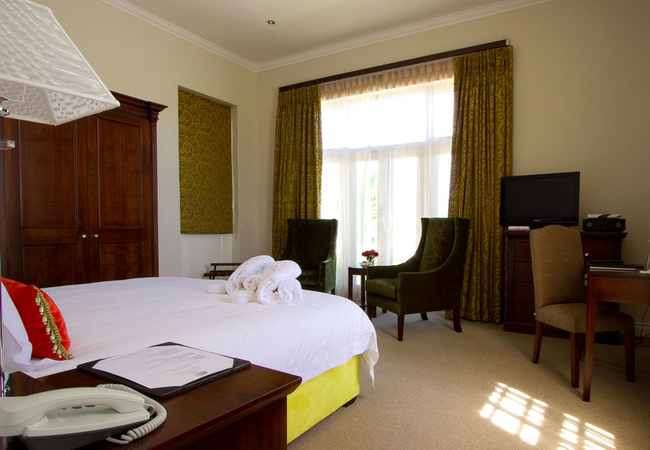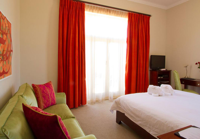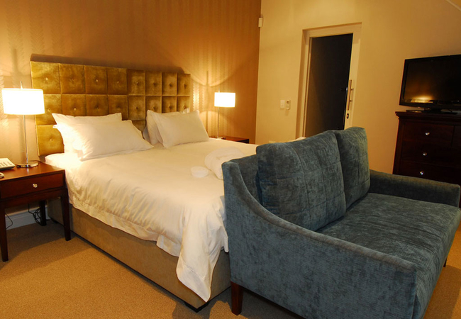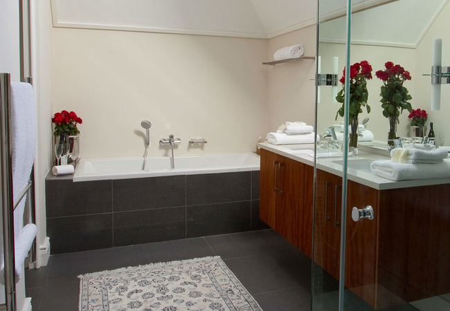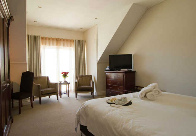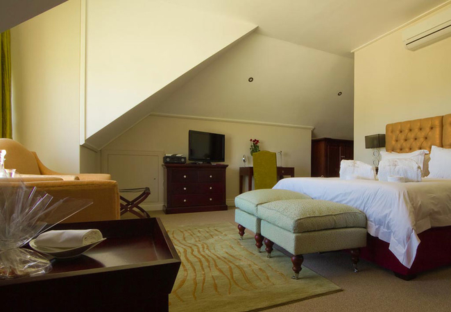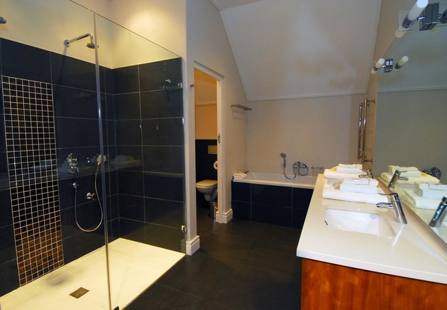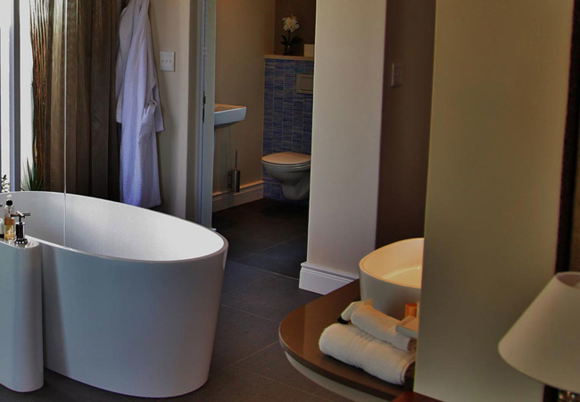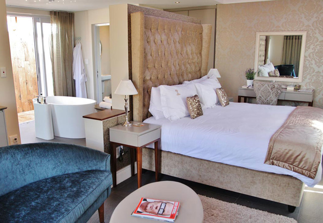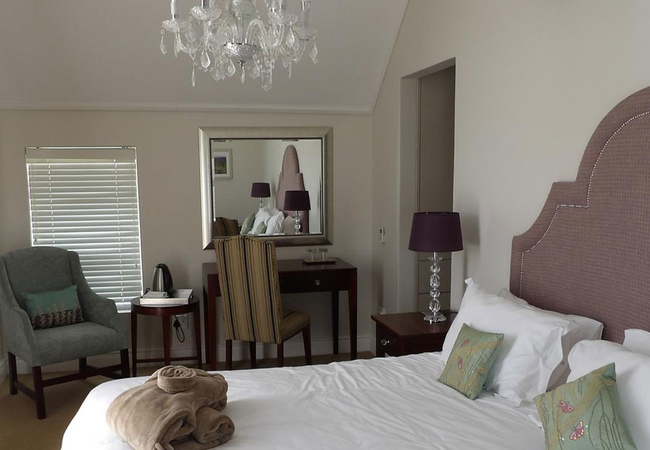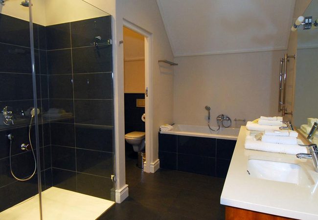 Wide views from this 5 Star Boutique Suite to the Hottentots-Holland Mountains in Somerset West characterise this spacious room. The bathroom is equipped with double washbasins, a double shower and a bath with separate toilet facilities.