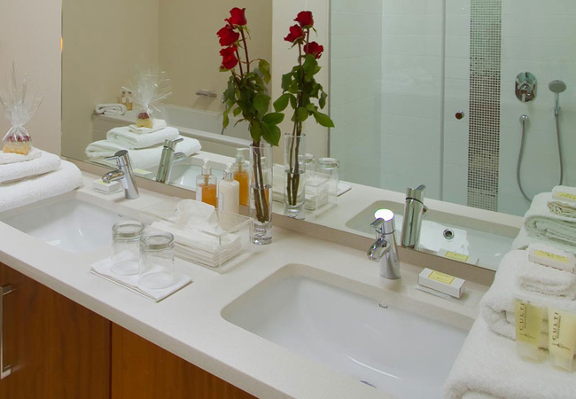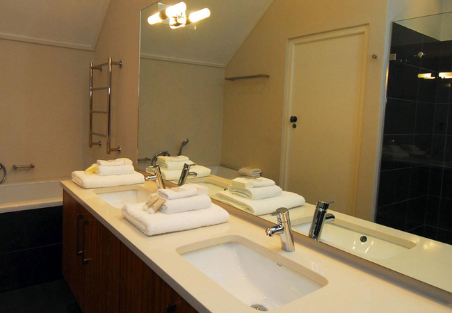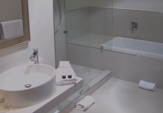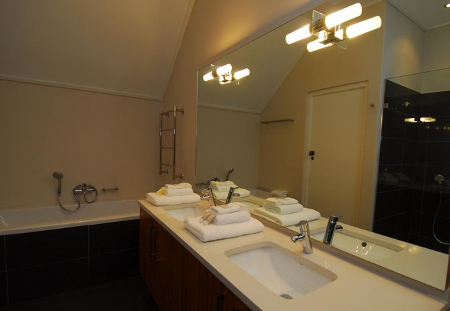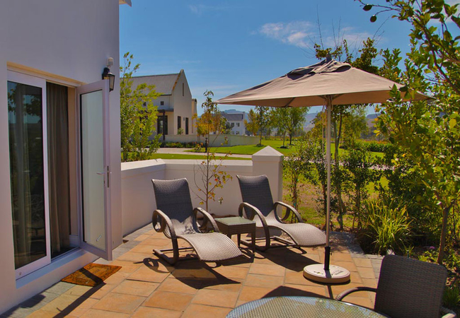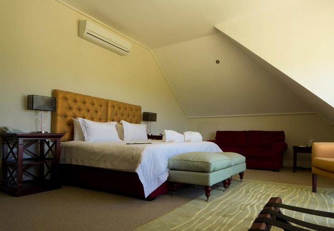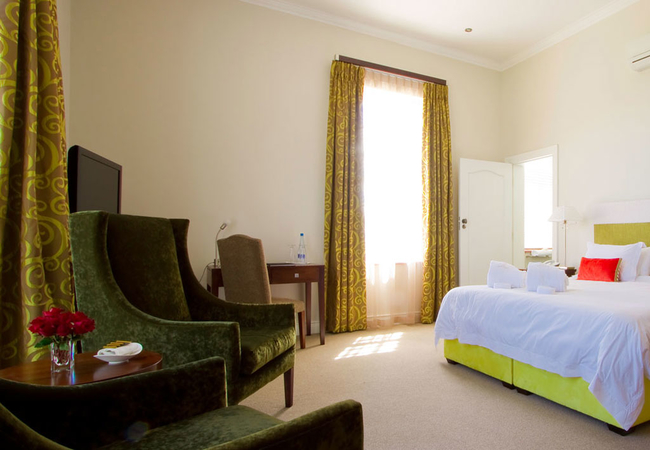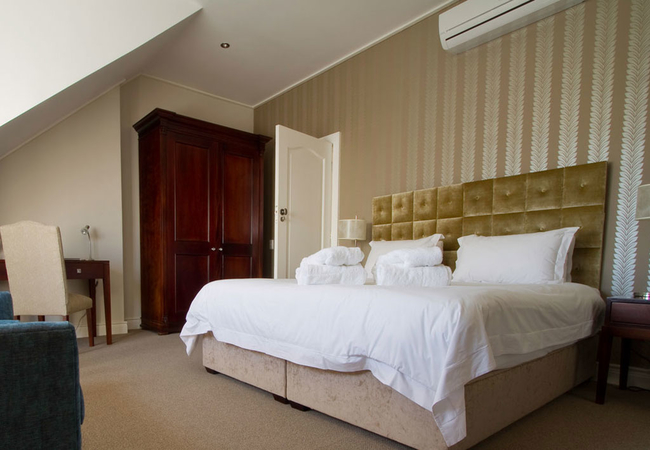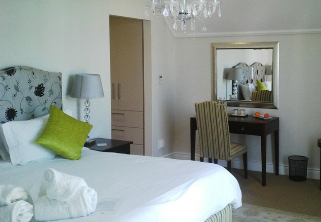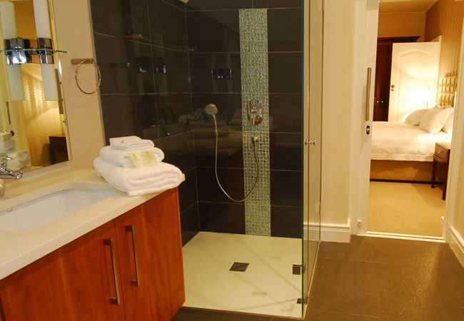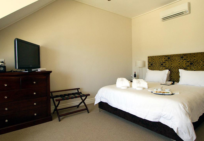 Wide views from this 5 Star Boutique Suite to the Hottentots-Holland Mountains in Somerset West characterise this spacious room. The bathroom is equipped with double washbasins, a double shower and a bath with separate toilet facilities.