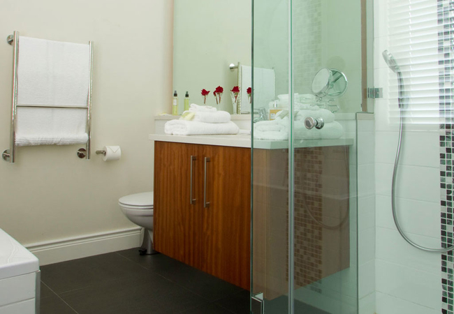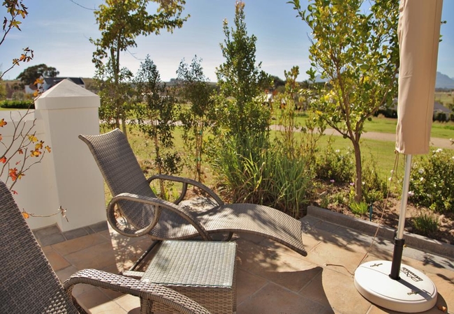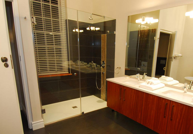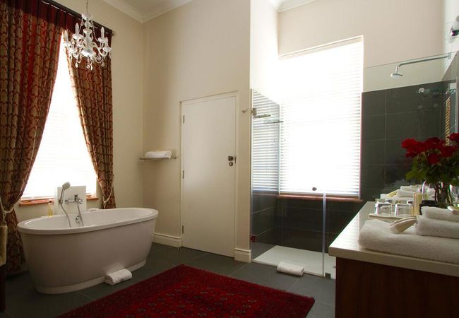 This spacious 5 Star Accommodation in Stellenbosch was the lounge and sunroom in the original manor house. The huge fireplace is equipped with a little wood stove, which creates a pleasant atmosphere in the cold winter months. An outer door gives direct access to a private patio. The sunny bathroom is equipped with a stand-alone bath and a double shower and washbasins.