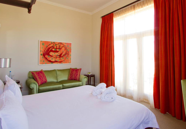 This was originally the main bedroom of the manor house with views in a western and southern direction. The room opens on a private patio. An outer door allows for private access, offering some of the finest accommodation, this is a true 5 Star experience in the Cape Winelands. The bathroom is fully equipped, with a bath and a shower.