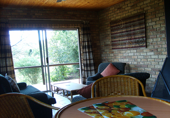 There is a well-equipped kitchenette with a fridge, two plate gas stove, oven, toaster, a microwave, kettle, crockery and cutlery. There is a dining table where you can enjoy your meals and a comfortable lounge area with a log fireplace.